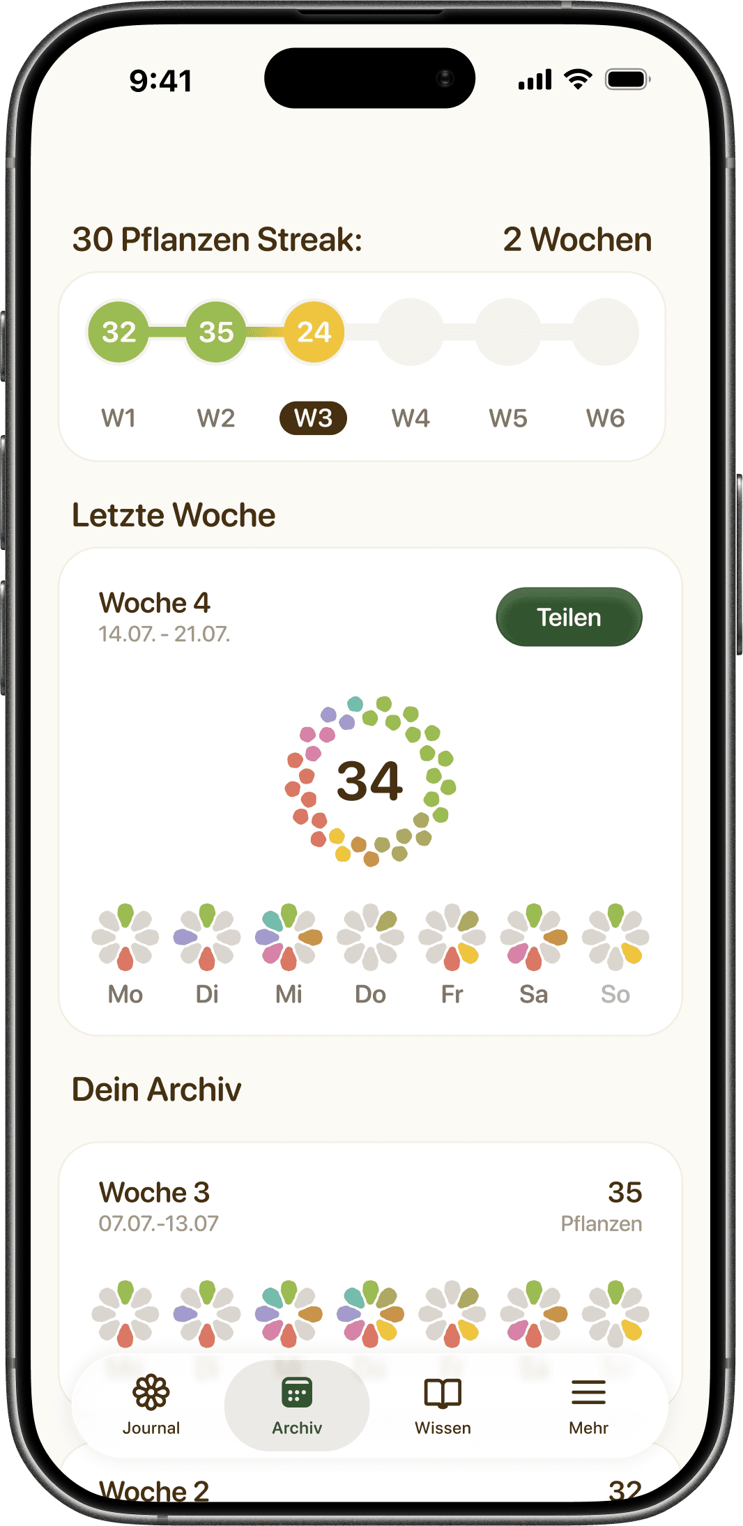 Eat 30 Plants ist die App, die Vielfalt auf deinen Teller bringt. Sie motiviert dich spielerisch dazu, jede Woche mindestens 30 verschiedene pflanzliche Lebensmittel zu essen – ganz ohne Diäten, Kalorienzählen oder Verzicht.